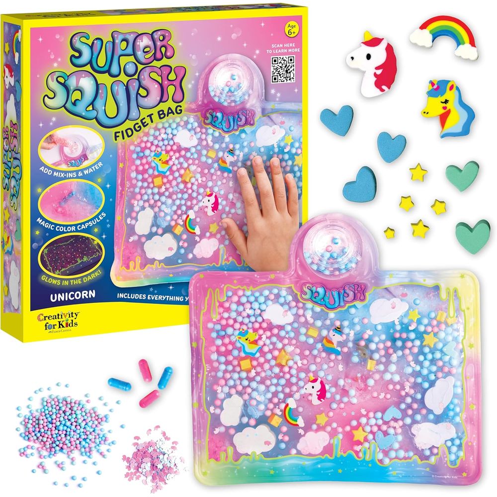 Relaja cuerpo y mente con el Super Squish Fidget, un kit sensorial súper creativo que permite preparar tu propio juguete “squishy” con solo añadir agua. Este set incluye una bolsa resistente con tapa a prueba de fugas, cápsulas mágicas para crear un gel tie-dye suave y maleable, más accesorios divertidos como confeti, cuentas, dijes y detalles que brillan en la oscuridad.