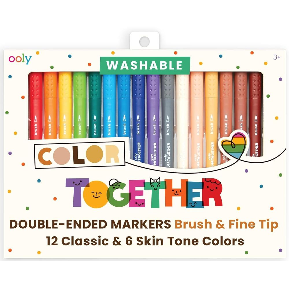 Desata la creatividad con este set de 18 marcadores dobles de la colección OOLY “Color Together”. Incluye 12 colores clásicos del arcoíris y 6 tonos de piel, proporcionando una gama versátil para que los niños (y los no tan niños) dibujen, coloreen y se expresen libremente. Cada marcador cuenta con una punta de pincel (brush tip) en un extremo y una punta de marcador tradicional en el otro, ideal para técnicas variadas: trazos finos, relleno, detalles o caligrafía creativa. Estos marcadores son lavables y no tóxicos, adecuados para niños a partir de 3 años. Un producto pensado para fomentar la inclusión, la diversidad y la imaginación en cada trazo.