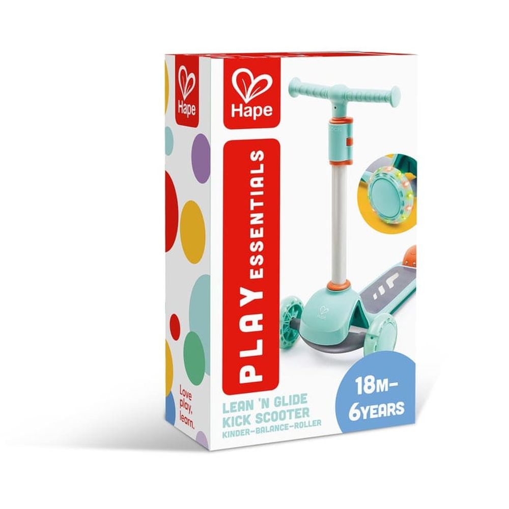 El patinete Hape Lean N Glide en color turquesa es perfecto para los pequeños aventureros: tiene tres ruedas para máxima estabilidad, manillar ajustable en 4 alturas y ruedas + plataforma con luces LED que se encienden al moverse. Su diseño inclinado-para-girar (“tilt-to-turn”) ofrece giros suaves y controlados, ideal para desarrollar equilibrio, coordinación y confianza motriz. Además, no requiere herramientas para armarlo: basta encajar el manillar en la base. Fabricado con materiales seguros y resistentes, es ideal para que los niños se diviertan mientras ganan seguridad.