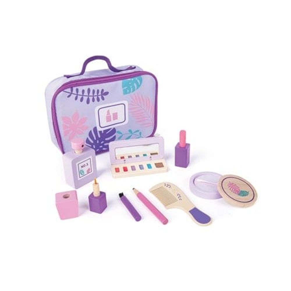 El set Pretend Make Up de Hape invita a los niños a jugar a maquillarse como los adultos: incluye una bolsa elegante, perfume, pintalabios, estuche de polvos con tapa, lápiz de cejas, botella esmaltada, caja de sombras y brocha. Todos los elementos se guardan cuidadosamente en la maleta cuando terminan de jugar, lo que desarrolla el sentido del orden. Este juego promueve la imaginación, el lenguaje y la confianza, mientras los niños exploran el rol de “maquillador/a”. Recomendado para edades desde 3 años.