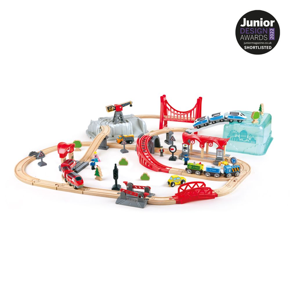 ¡Emprende una divertida aventura en tren por la ciudad! Este juego de cubos portátil está lleno de accesorios, como árboles, señales y vehículos. Encontrarás este maravilloso juego en una caja de almacenamiento que forma parte del escenario de juego.